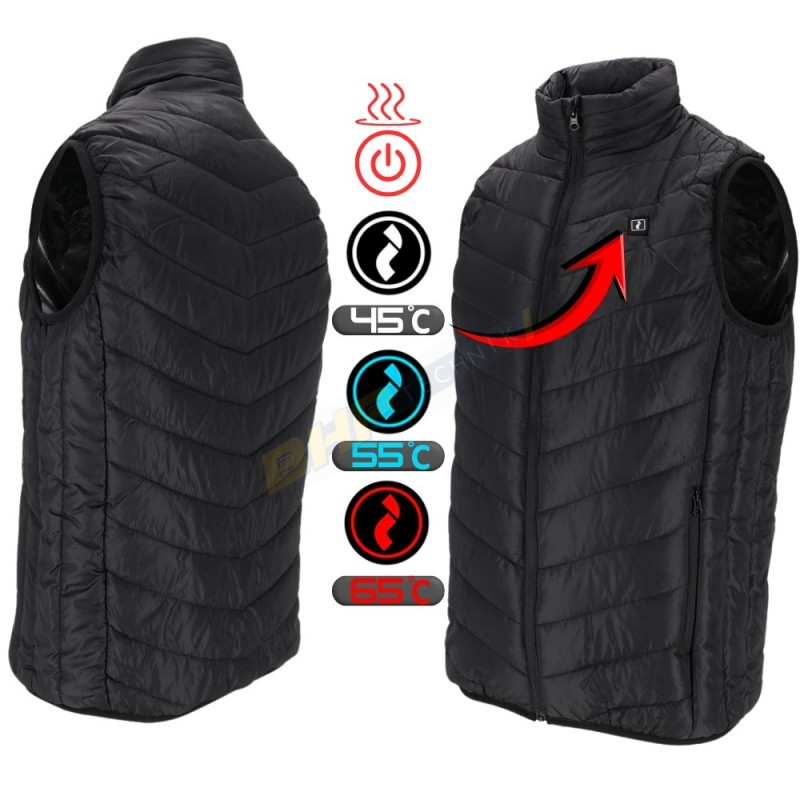 - kieszeń wewnętrzna z wodoodpornym kablem USB (z osłoną zabezpieczającą złącze) do podpięcia powerbanka zapinana na suwak- wodoodporne panele grzewcze z trzystopniową regulacją w dwóch strefach - plecy oraz klatka piersiowa